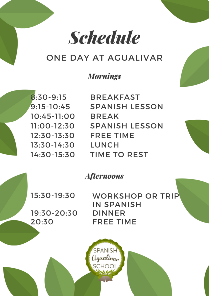 Here we show you how is a day in Agualivar. You will live with our family, share the meals with us, attend the lessons in the morning and have two activities or workshops in the afternoon, as well as one trip per week. But also you will have free time to study, relax and discover the surroundings by yourself.